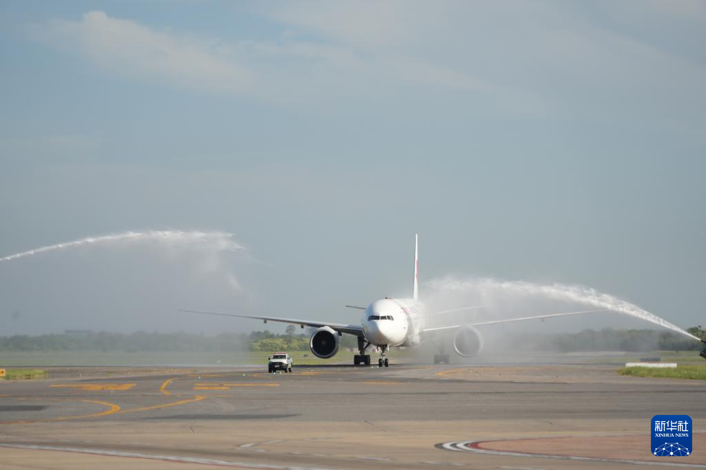 12月4日,中国东方航空公司MU745航班抵达阿根廷首都布宜诺斯艾利斯埃塞萨国际机场后通过“水门”。这标志着中阿两国之间首条直航航线开通。