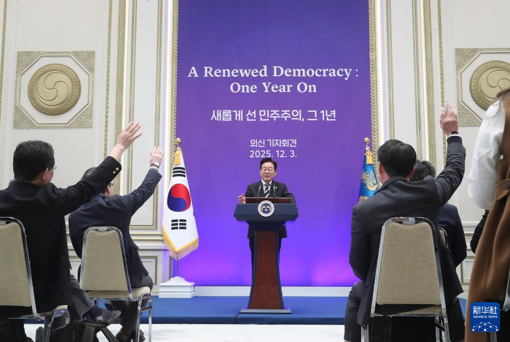 12月3日,在韩国首都首尔青瓦台迎宾馆,韩国总统李在明举行外媒记者会。