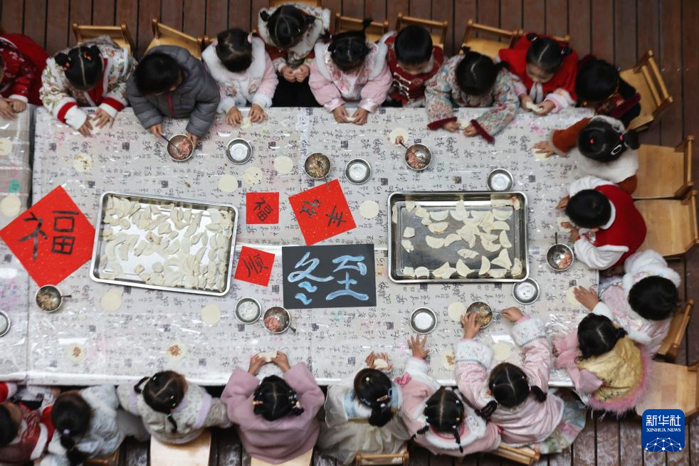 12月18日,浙江省湖州市德清县乾元镇第一幼儿园小朋友在包饺子,迎接冬至。
