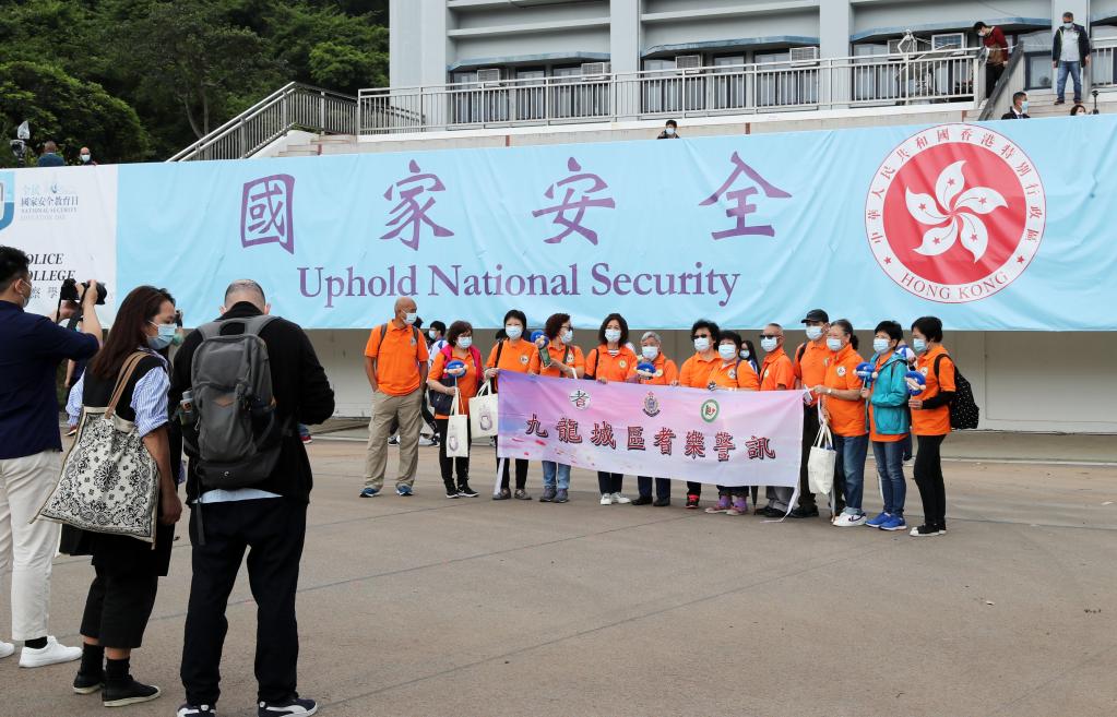 2021年4月15日,在香港警察學(xué)院,香港市民在全民國家安全教育日活動上合影留念。新華社記者 李鋼 攝