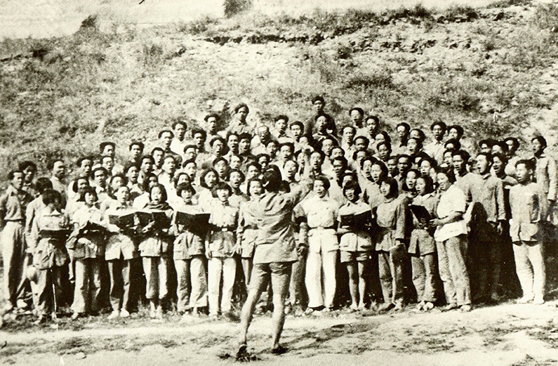 这是 1939 年冼星海指挥鲁艺学员排练《黄河大合唱》的资料照片