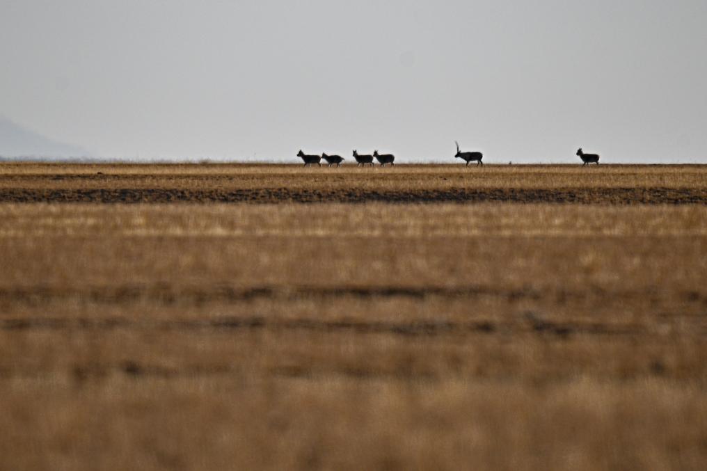 在阿尔金山国家级自然保护区,一只雄性藏羚羊带领五只雌性觅食(12月7日摄)。