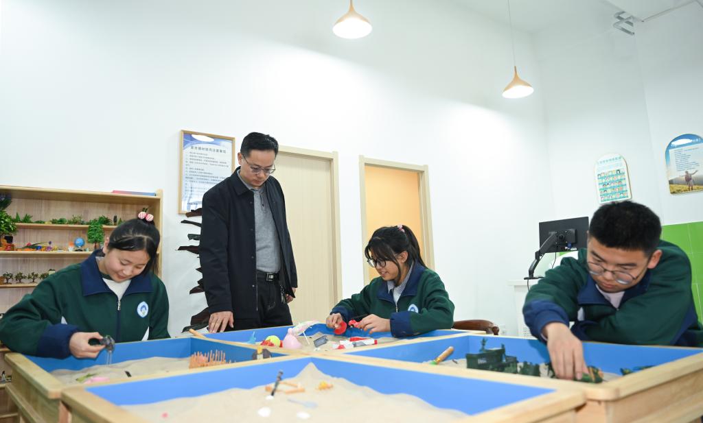 12月24日,在青海省海北藏族自治州门源县浩门镇高级中学,山东援青教师李学鹏(左二)在心理教室指导学生。