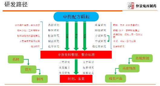 中藥配方顆粒的研制路線是從產(chǎn)品研制開始,要經(jīng)過標準復核、現(xiàn)場檢查、專家評審等環(huán)節(jié),最終需獲得藥監(jiān)管理部門的備案許可。研制路徑的重點主要是前期大量文獻的調(diào)研、過程中質(zhì)量控制的一致性研究和工藝的穩(wěn)定性、有效性再評價等,對企業(yè)的研發(fā)、人才及經(jīng)濟方面的投入要求非常高。