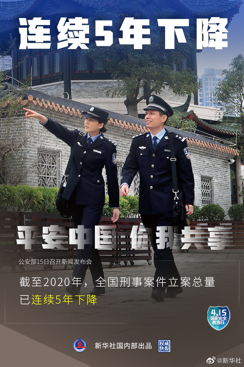 4月15日是第六個全民國家安全教育日,公安部15日召開新聞發(fā)布會介紹:2020年全國群眾安全感為98.4%,全國居民對社會治安滿意度達83.6%。截至2020年,全國刑事案件立案總量連續(xù)5年下降,八類主要刑事案件數(shù)和查處治安案件數(shù)連續(xù)6年下降。(記者熊豐,海報設(shè)計張晨光)