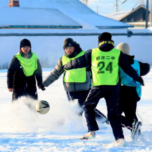 额尔古纳市第二中学的校园里也因为“雪假”变得充满活力。平日里就喜欢踢足球的七年级一班学生马伊鑫跟同学们在操场上踢起了雪地足球。