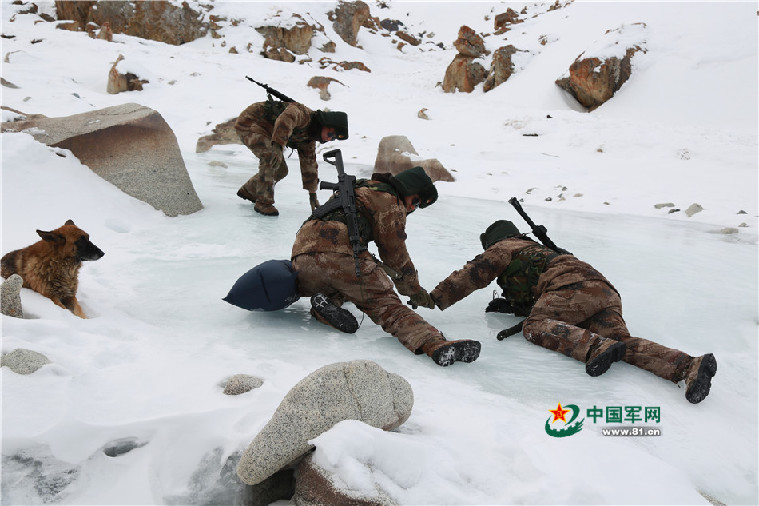 Soldiers work together to get through a sloping glacier. Soldiers from a border defense company under the PLA Xinjiang Military Command (MC) stationed in Khunjerab Pass of the Pamir Plateau patrolled the China-Pakistan border at an altitude of 5283 meters in frigid weather conditions.