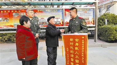 12月9日,孫書偉老人(右二)趕到武警煙臺(tái)療養(yǎng)院,將致謝錦旗送給楊紅榮(右一)。