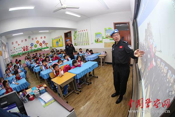 維和警察亓恒剛為青島市樺川路小學的師生們講述在利比里亞的執(zhí)勤任務。