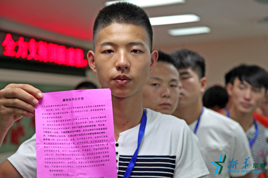 ????新華網(wǎng)鄭州8月11日電(雒根生)“當兵入伍是為國家做貢獻盡義務,不需要繳納任何費用。凡是以幫忙找關系為由要錢要物的情形,都是騙人的!”河南省武陟縣喬廟鄉(xiāng)18周歲的預征對象王云祥10日收到了武陟縣征兵辦印制的《廉潔征兵公開信》。為確保不發(fā)生一起違反征兵政策現(xiàn)象,武陟縣征兵辦公室專門印制1000份廉潔征兵公開信發(fā)放給每一位參檢對象及家長,并公布了省市縣三級監(jiān)督舉報電話。
