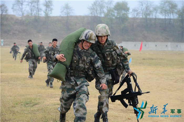 2015年10月22日,部隊組織百人反恐突擊隊考核,圖為隊員模擬搬運傷員