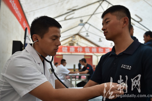 圖為醫(yī)護(hù)人員使用聽診器對隊(duì)員身體進(jìn)行檢查