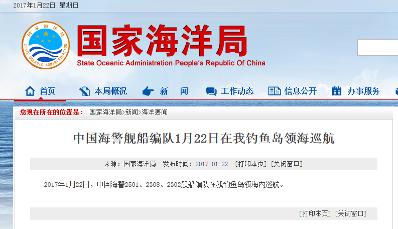 新華網(wǎng)北京1月22日電 據(jù)國(guó)家海洋局網(wǎng)站報(bào)道,2017年1月22日,中國(guó)海警2501、2308、2302艦船編隊(duì)在我釣魚(yú)島領(lǐng)海內(nèi)巡航。
