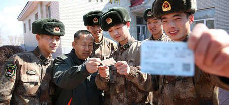 張青葉給官兵們送車票。圖片來源:軍報記者
