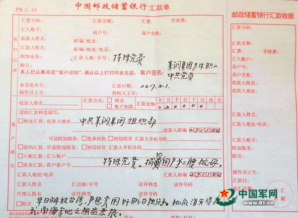 2月6日,山東省鋼鐵集團(tuán)有限公司萊鋼黨委組織部接到一張匯款單,金額為兩萬(wàn)元整,簽名為“中共黨員、萊鋼集團(tuán)退休職工”,附言:“特殊黨費(fèi),捐給國(guó)產(chǎn)第二艘航母……”
