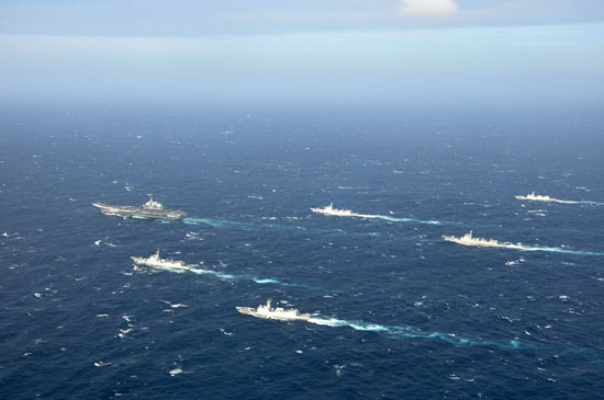 2016年12月26日,執(zhí)行跨海區(qū)訓(xùn)練任務(wù)的中國海軍遼寧艦航母編隊。視覺中國供圖(資料圖片)