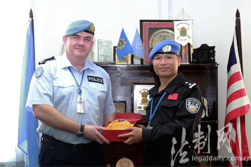 ????藍(lán)隊(duì)長向總警監(jiān)匯報(bào)了中國防暴隊(duì)編成、物資裝備、甄選考核以及抵達(dá)任務(wù)區(qū)后執(zhí)行維和勤務(wù)等情況,介紹了中國防暴隊(duì)在部隊(duì)正規(guī)化建設(shè)、治安形勢研判、后勤綜合保障等方面經(jīng)驗(yàn)做法,并表示將恪守聯(lián)合國核心價(jià)值,堅(jiān)決服從聯(lián)利團(tuán)指揮鏈條,嚴(yán)格落實(shí)防暴辦下達(dá)的各項(xiàng)指令任務(wù),繼續(xù)保持和發(fā)揚(yáng)中國維和警隊(duì)紀(jì)律嚴(yán)明、敢打硬仗的優(yōu)良傳統(tǒng)。