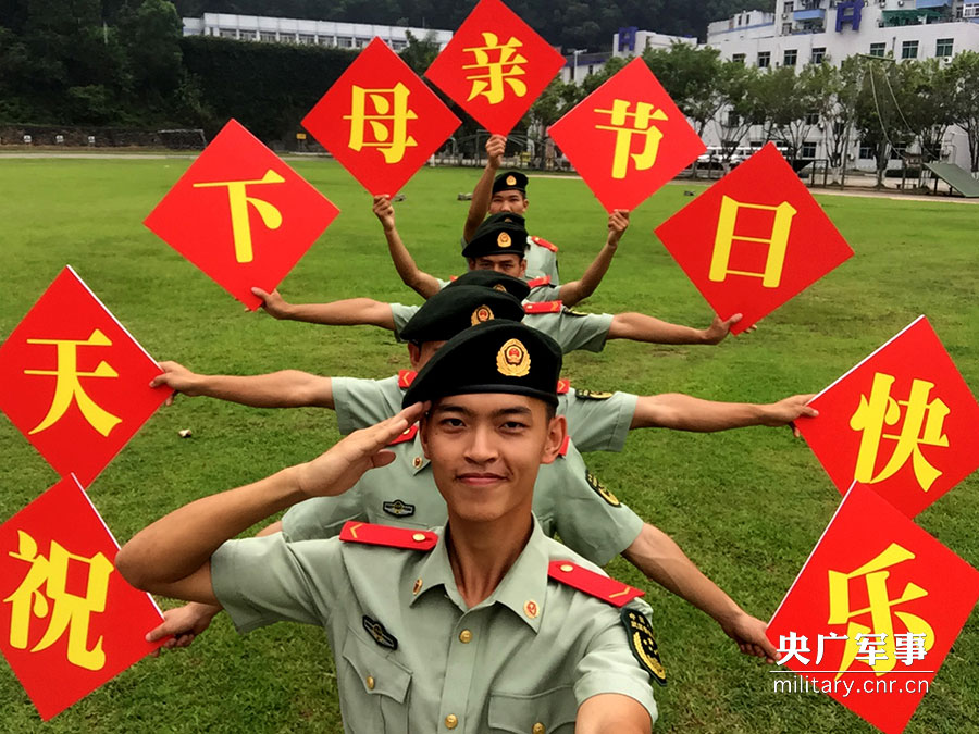 5月13日,武警廣東省邊防總隊(duì)機(jī)動(dòng)支隊(duì)官兵手舉祝福語(yǔ),一起為母親送上節(jié)日問(wèn)候。