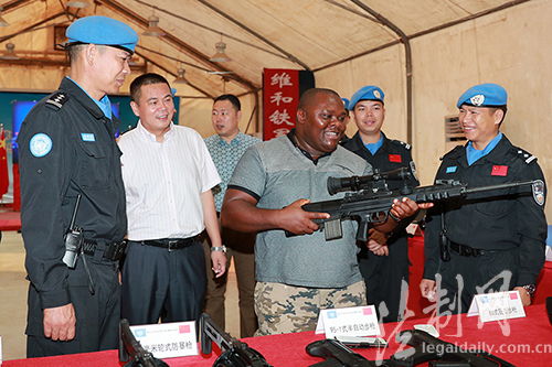 圖為利比里亞國防部副部長圣·杰羅姆·拉巴利觀摩防暴隊(duì)武器裝備展示