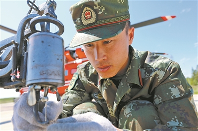 日曬、風(fēng)吹、雨淋,直升機(jī)的“衣服”——蒙布發(fā)生破損怎么辦?這可難不住心靈手巧的官兵。你看,武警森林指揮部直升機(jī)支隊(duì)的代理機(jī)械師王丹宇就自己動(dòng)手,從老鄉(xiāng)那里借來手搖修鞋機(jī),頂著盛夏的烈日一針一線仔細(xì)修補(bǔ),看起來還挺有小裁縫的范兒呢。韓興華 攝