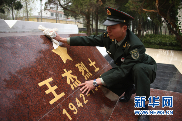 “王杰班”第29任班長劉佳玉擦拭王杰烈士紀念碑(2014年4月3日攝)。新華社發(fā)(趙聰 攝)