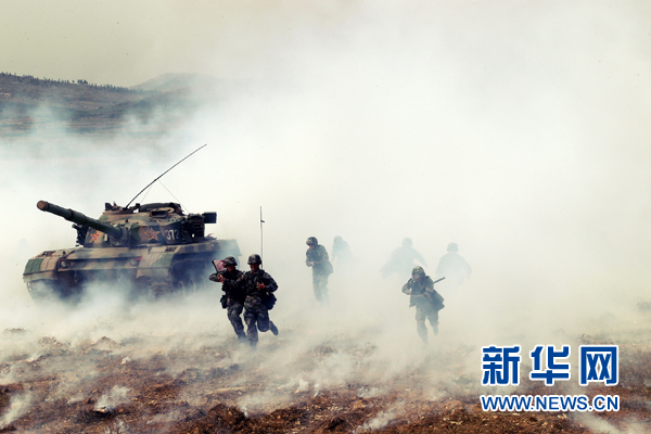 在一次實兵演習中,“王杰班”所在連隊官兵配合坦克突入“敵”一線陣地(2014年10月16日攝)。新華社發(fā)(王磊 攝)