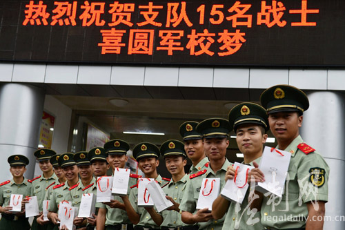 ????昔日禁毒反恐當(dāng)尖兵,今朝題名金榜站排頭!正當(dāng)各地紛紛樂道高考升學(xué)率的同時(shí),南粵邊防警營(yíng)也傳來(lái)喜報(bào)。8月28日,深圳銀湖山訓(xùn)練基地里處處洋溢著喜悅;禁毒尖兵、狙擊手、士官楊平申等來(lái)至廣東公安邊防總隊(duì)機(jī)動(dòng)支隊(duì)的15名戰(zhàn)士喜圓軍校夢(mèng),被廊坊武警學(xué)院、公安邊防高等??茖W(xué)校等3所部隊(duì)院校錄取,戰(zhàn)友們?yōu)樗麄兣e行簡(jiǎn)樸而隆重的歡送儀式。據(jù)悉,連續(xù)多年來(lái),這個(gè)支隊(duì)在廣東邊防總隊(duì)40多個(gè)基層單位中戰(zhàn)士升學(xué)率名列前茅。