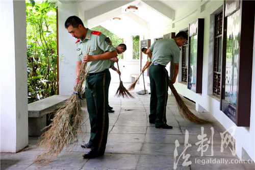 圖為臨退老兵到駐地社區(qū)公共場所義務(wù)勞動