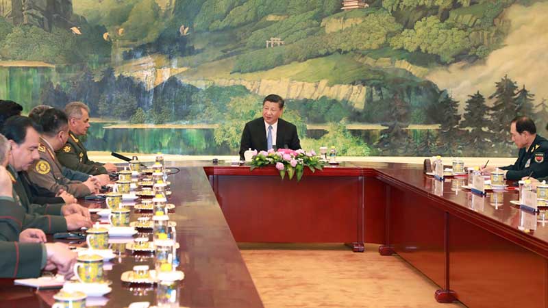 ????新華社北京4月23日電(記者梅世雄)國(guó)家主席習(xí)近平23日在人民大會(huì)堂集體會(huì)見(jiàn)上海合作組織成員國(guó)國(guó)防部長(zhǎng)。俄羅斯國(guó)防部長(zhǎng)紹伊古、哈薩克斯坦國(guó)防部長(zhǎng)扎蘇扎科夫、吉爾吉斯共和國(guó)武裝力量總參謀長(zhǎng)杜伊申比耶夫、巴基斯坦國(guó)防部長(zhǎng)達(dá)斯特吉爾·汗、塔吉克斯坦國(guó)防部長(zhǎng)米爾佐、烏茲別克斯坦國(guó)防部長(zhǎng)阿濟(jì)佐夫,上海合作組織副秘書(shū)長(zhǎng)索韋托維奇,上海合作組織地區(qū)反恐怖機(jī)構(gòu)執(zhí)行委員會(huì)副主任吉約索夫、印度駐華大使班浩然以及作為特邀嘉賓列席此次會(huì)議的白俄羅斯國(guó)防部長(zhǎng)拉夫科夫參加會(huì)見(jiàn)。