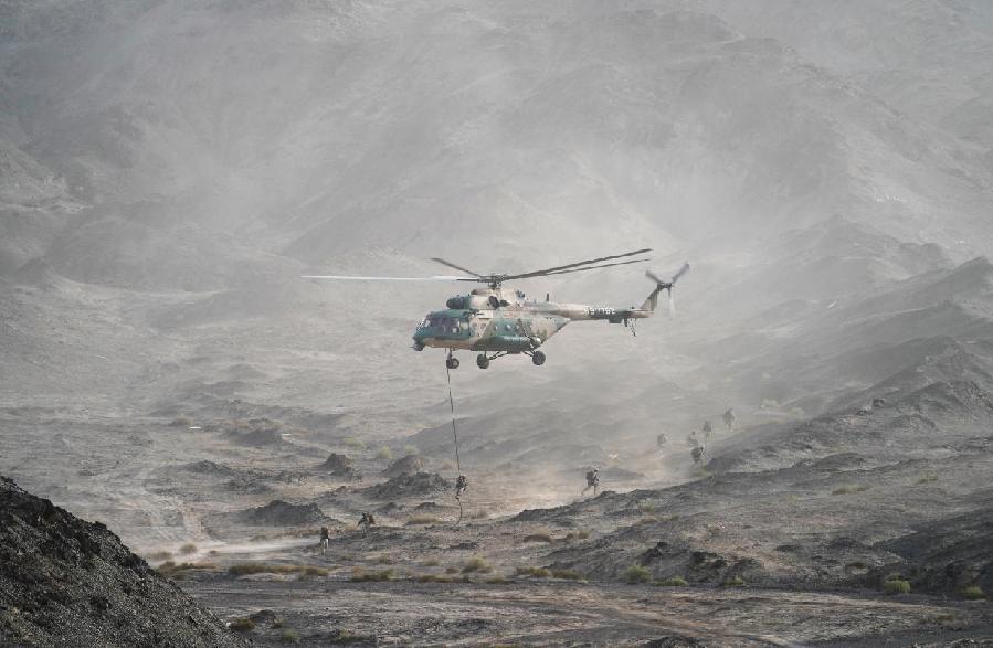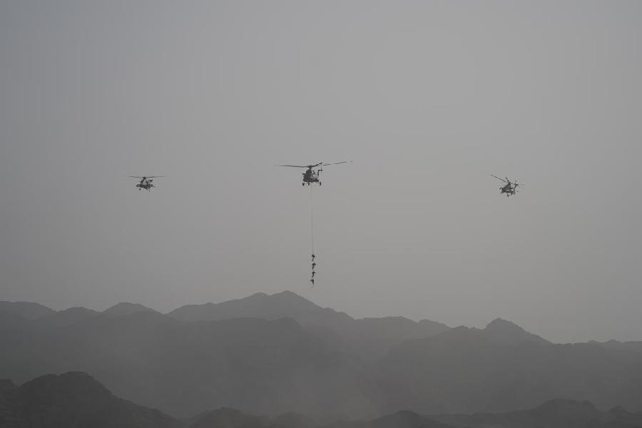 ????23日清晨,荒山丘陵遍布的庫(kù)爾勒訓(xùn)練基地,某特戰(zhàn)旅特戰(zhàn)分隊(duì)乘坐直升機(jī)迅速向“恐怖分子”的營(yíng)地機(jī)動(dòng),演練的第一個(gè)課目就這樣毫無(wú)征兆地打響。