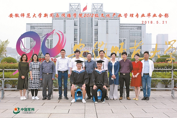 5月21日,安徽師范大學新聞與傳播學院組織應(yīng)屆畢業(yè)生拍攝畢業(yè)照,眾多班級的學生依次排隊拍攝,其中一個班級與眾不同——只有兩名學生,而與他倆合影的卻有11名老師。并且,11名老師站在后排,兩名學生坐在前排。當相機的快門摁下之后,這張照片成為該校濃厚尊崇軍人氛圍的亮麗名片。