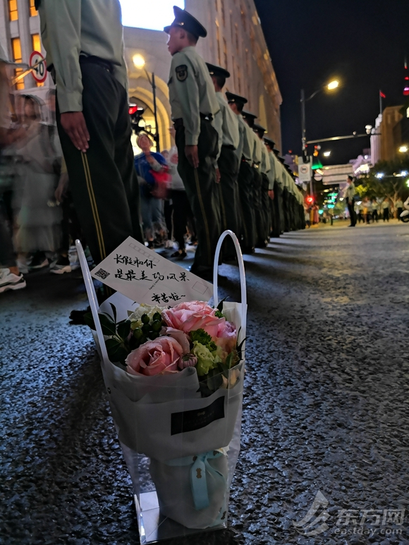 10月4日晚21時(shí)10分,在南京路步行街十字路口,一位姑娘手捧鮮花走執(zhí)勤官兵面前:“辛苦你們,這束花送給你們!”放下轉(zhuǎn)身便消失在人群之中。當(dāng)執(zhí)勤官兵拿起鮮花時(shí)驚喜地發(fā)現(xiàn),里面還夾了一張?zhí)刂频拿餍牌晷愕淖舟E寫(xiě)到:“長(zhǎng)假和你,是最美麗的風(fēng)景。辛苦啦~比心~”