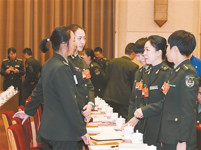 ??? 三月七日上午,出席十三屆全國人大二次會議的解放軍和武警部隊(duì)代表團(tuán)舉行第一次全體會議。會議間隙,女代表們相互討論交流。解放軍報記者 馮凱旋攝