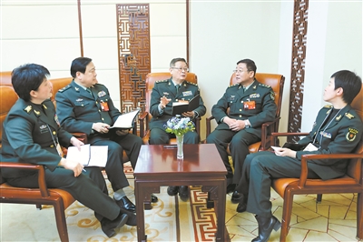 本報記者鄒維榮(左一)、柴華(右一)采訪軍隊(duì)政協(xié)委員曲新勇、王健、吳剛(左二至左四)。中國軍網(wǎng)記者 孫智英 攝