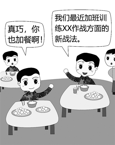 ????“真巧,你也來(lái)加餐啊?!薄笆前?,我們營(yíng)最近在研訓(xùn)新戰(zhàn)法,有時(shí)會(huì)加班訓(xùn)練……我跟你說,我們研究的新戰(zhàn)法主要是××作戰(zhàn)方面,據(jù)說要在全旅推廣呢!”