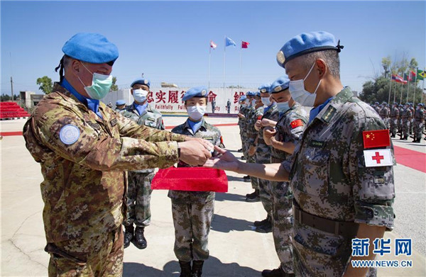 ????6月16日,中國第18批赴黎巴嫩維和部隊(duì)全體410名官兵被授予聯(lián)合國勛章,以表彰他們在任務(wù)期內(nèi)為維護(hù)黎巴嫩南部地區(qū)和平與穩(wěn)定做出的突出貢獻(xiàn)。新華社發(fā)(彭希 攝)