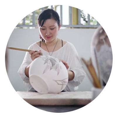 我從小就很喜歡繪畫,大學的時候認識了我的先生,他帶我去了醴陵。當時我看到幾個小女孩拿毛筆在瓶子上細細地勾線,我很喜歡她們這種狀態(tài),想著自己也可以嘗試一下。父親也很鼓勵我,想讓我從事這方面的工作,所以常常帶我去寫生,慢慢地我就愛上了這門技藝。我們醴陵瓷傳統(tǒng)的核心工藝是分水,父親在傳統(tǒng)工藝中總結(jié)出“薄施淡染”技法,主要表現(xiàn)對象是花卉,它能使花卉層次更加豐富、水靈通透,體現(xiàn)醴陵瓷清雅淡逸、意態(tài)高潔的陶瓷語言,所以我們現(xiàn)在的創(chuàng)作仍然以花卉為主,而這次在清華的學習,讓我拓寬了許多思路,我想在山水和其他物象中嘗試去用我們工藝來表現(xiàn),希望今后能給觀者帶來一些新的感受。