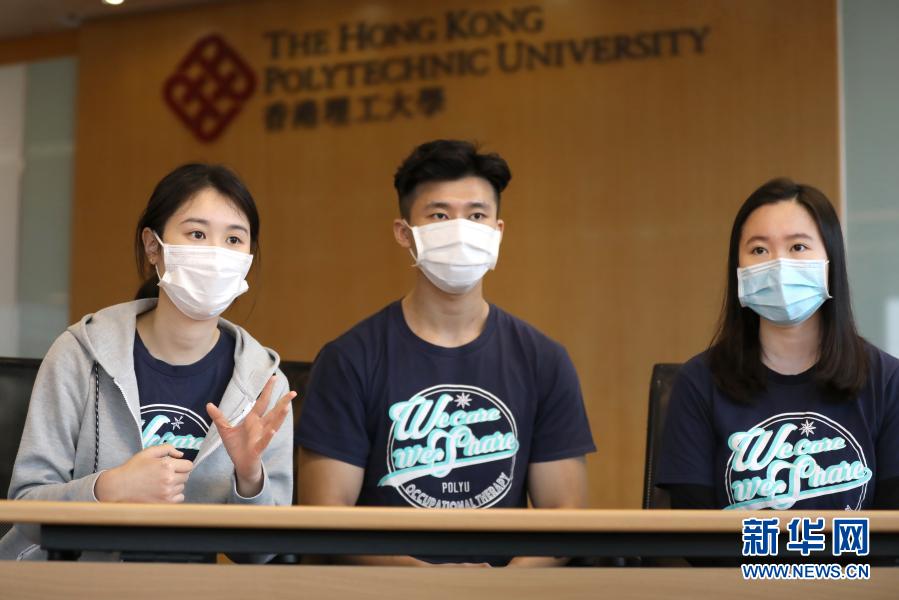 香港理大康復治療科學系職業(yè)治療學四年級學生李舒平、香港理大康復治療科學系職業(yè)治療學三年級學生李穎東、香港理大康復治療科學系職業(yè)治療學三年級學生梁熙童在接受新華社記者采訪(自左至右;2020年12月12日攝)。新華社記者 吳曉初 攝