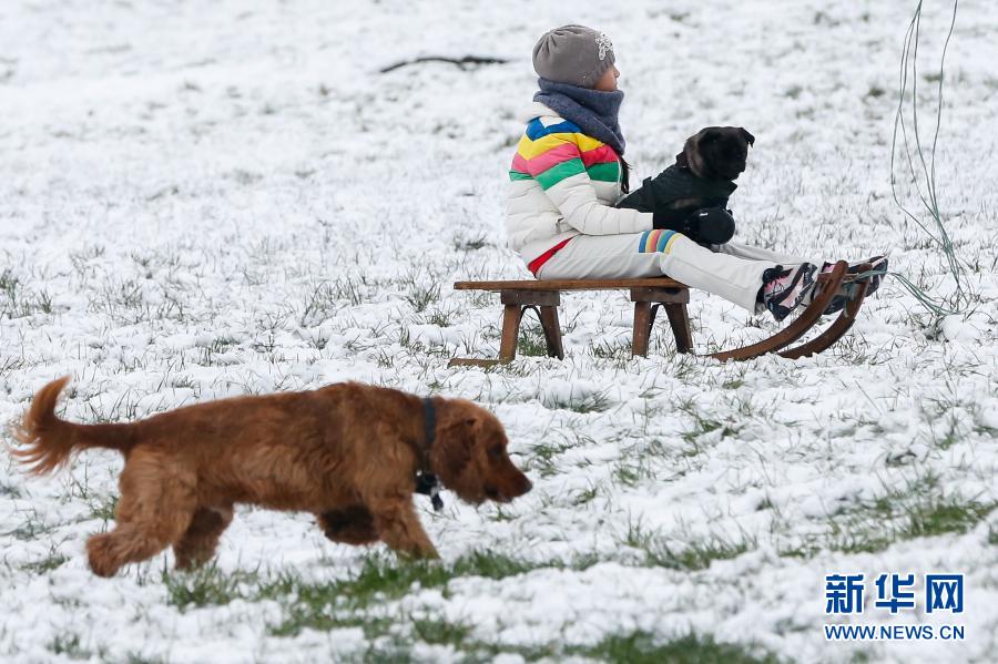 1月24日,在英國(guó)倫敦,一名兒童抱著小狗坐在雪橇上。新華社記者韓巖攝