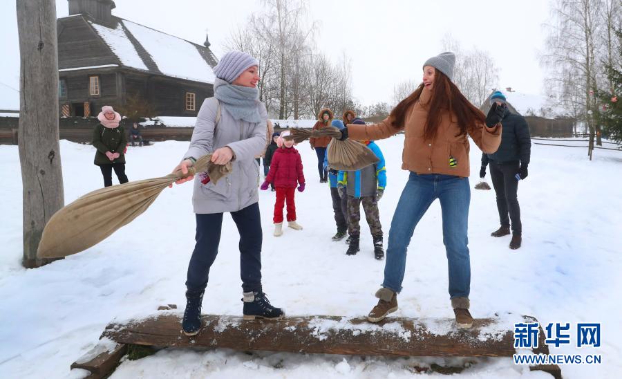 1月24日,年輕人在白俄羅斯首都明斯克郊區(qū)的民族建筑博物館參與傳統(tǒng)的冰雪游戲。新華社發(fā)(任科夫攝)