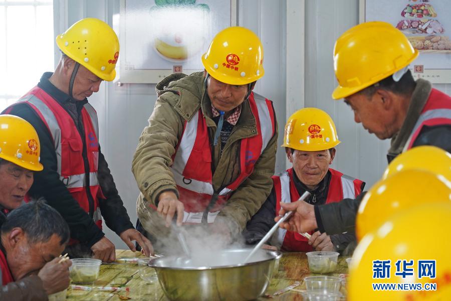中鐵四局建筑工人們?cè)诠さ厥程镁鄄统燥溩樱?月4日攝)。