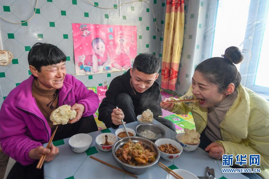 2月9日,在吉林省長(zhǎng)春市農(nóng)安縣楊樹林鄉(xiāng)牛尾巴山村,付寶印的母親鐘士輝(左)與付寶印的姐姐付寶賀(右)、外甥趙天寶(中)吃飯。新華社記者 張楠 攝