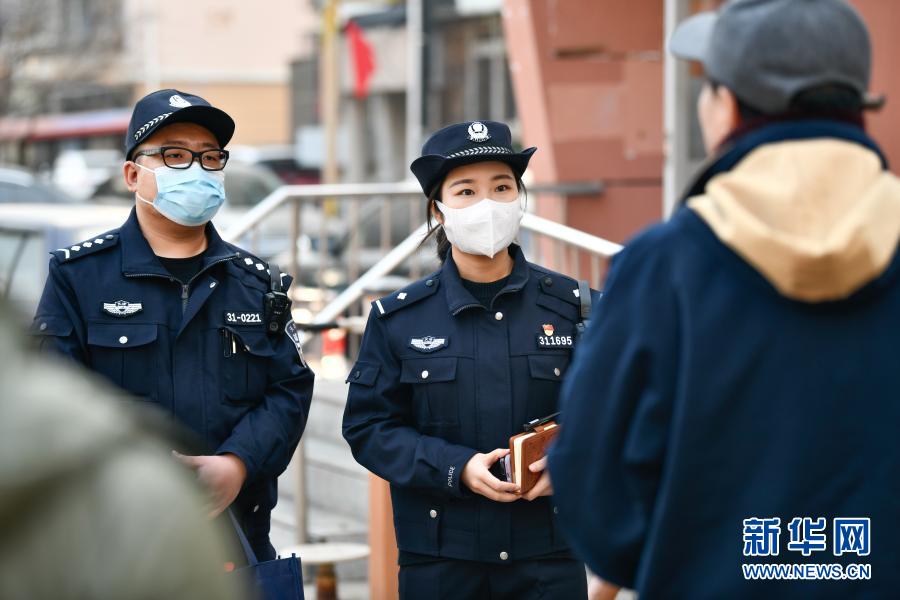 2月11日,在天津市紅橋區(qū)隆春里社區(qū),楊曉惠(中)與輔警郝旭(左)向晨練的社區(qū)居民問詢社區(qū)情況。新華社發(fā)(孫凡越攝)
