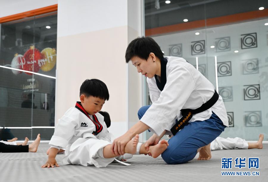 2月15日,陳燕亭在教小朋友練習(xí)跆拳道。新華社記者 林善傳 攝