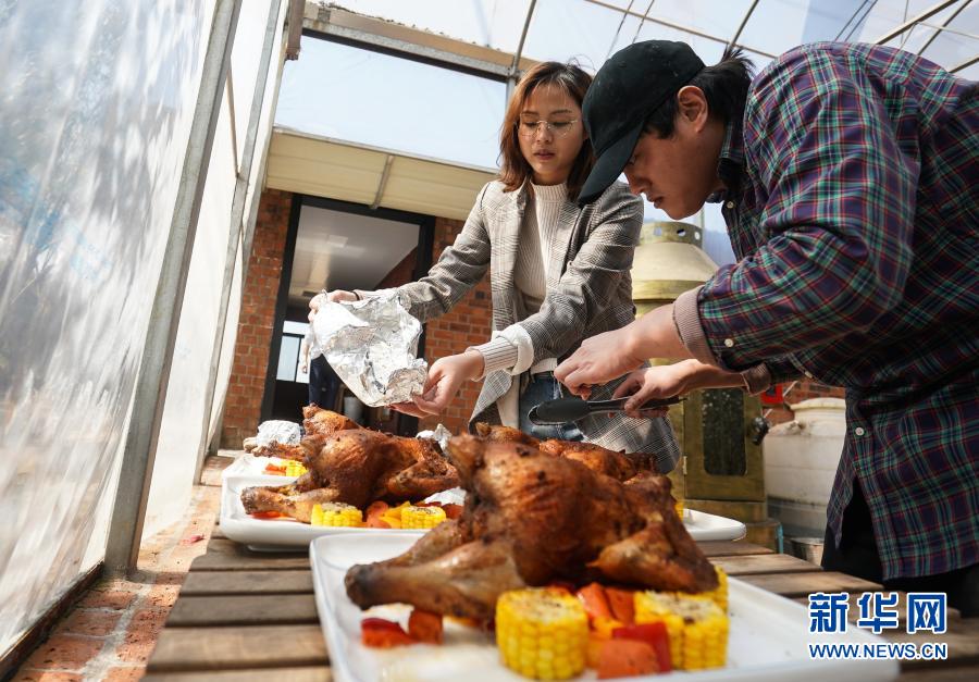 謝丞恩(左)和二哥謝丞皓在農(nóng)場內(nèi)給參觀的客人準(zhǔn)備烤雞(2月20日攝)。新華社記者 季春鵬 攝