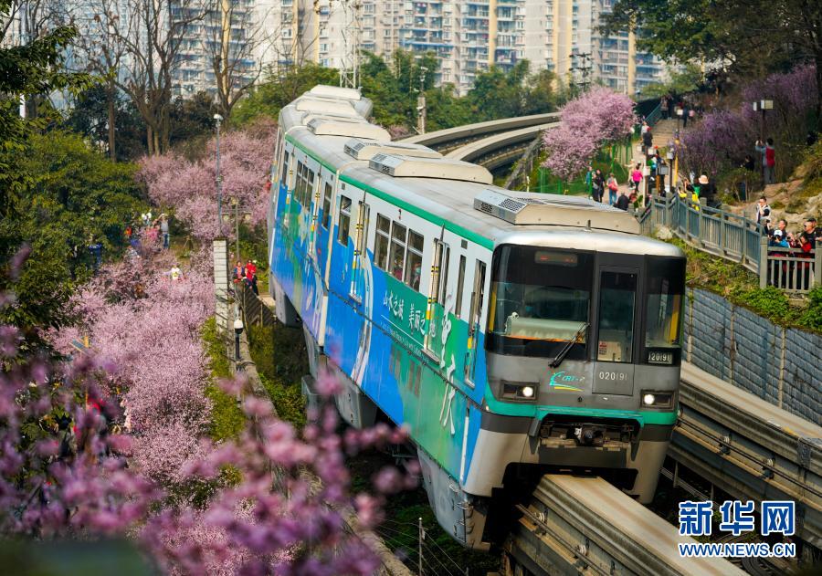 2月23日,在重慶軌道交通2號(hào)線佛圖關(guān)段,一列單軌列車穿越花海奔馳而過(guò)。
