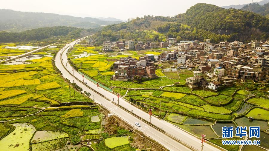 初春時節(jié),位于貴州省黔東南苗族侗族自治州從江縣貫洞鎮(zhèn)附近的油菜花陸續(xù)盛開,宛若大地披金。古樸寧靜的村莊、四通八達的鄉(xiāng)村路、色彩斑斕的田野,構(gòu)成春日里一幅幅美麗的鄉(xiāng)村畫卷。