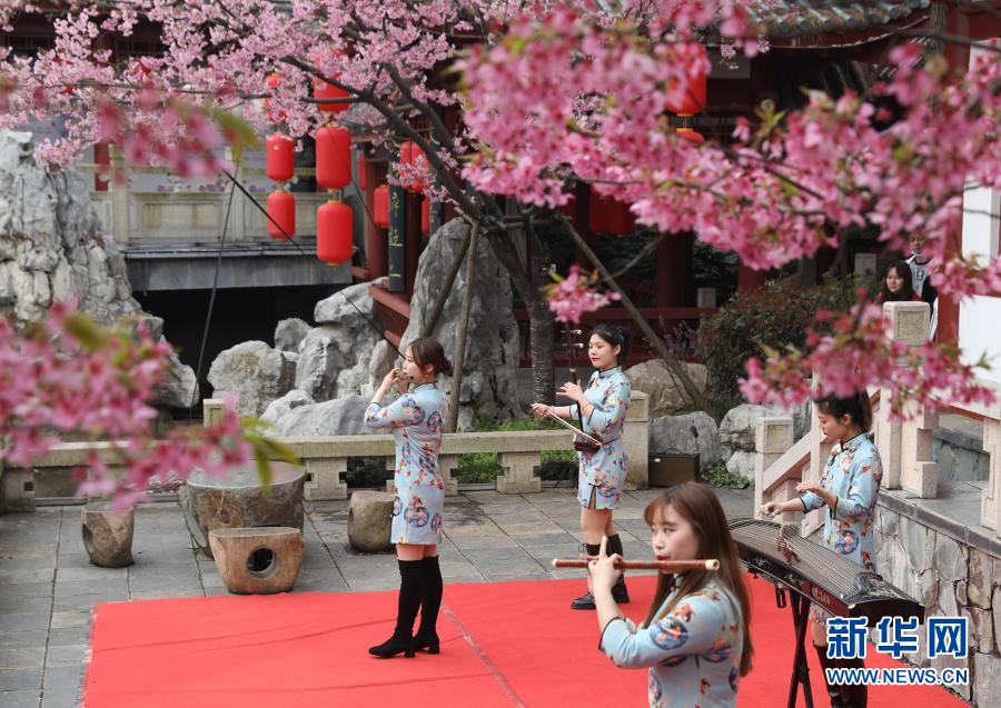 2月27日,演員在武漢東湖櫻花園表演節(jié)目。