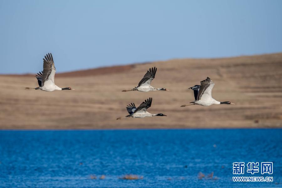 黑頸鶴在大山包黑頸鶴國(guó)家級(jí)自然保護(hù)區(qū)飛翔(2月24日攝)。新華社記者 胡超 攝