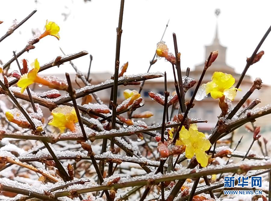 3月1日在北京中國人民革命軍事博物館附近拍攝的被冰雪覆蓋的迎春花。